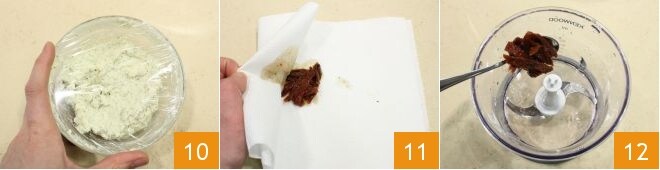 luego cubran la crema con film transparente 10 y colóquenla en el refrigerador durante unos 30 minutos. Ocúpense de la segunda crema: tomen los tomates secos en aceite, escúrranlos, séquenlos del exceso de aceite con un paño de cocina 11 y colóquenlos en el procesador 12,