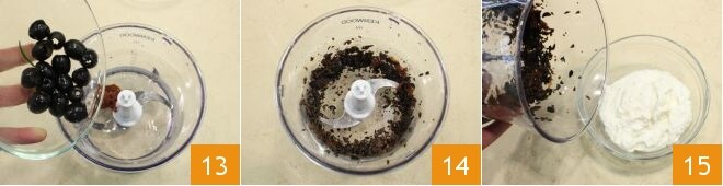 agreguen también las aceitunas negras deshuesadas 13 y trituren todo por unos instantes 14, incorporen la mezcla a la crema restante de ricotta 15, sazonar con una pizca de pimienta blanca y sal, mezclen con una cuchara para integrar los ingredientes, cubran con film y colóquenla a endurecer en el refrigerador por 30 minutos.