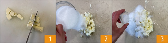 Para preparar los baci de Frau empieza con la masa: corta la mantequilla a temperatura ambiente en trozos pequeños 1. Vierte el azúcar 2 y la sal de Maldon 3 por encima.