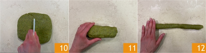 Recupera la masa y divídela por la mitad 10, enrolla 11 una mitad para formar un bastón 12.