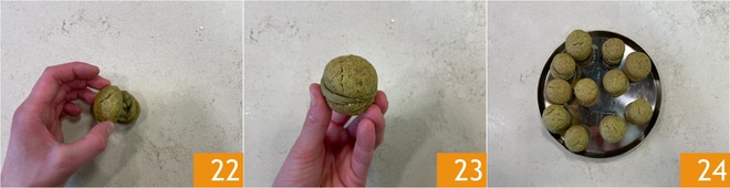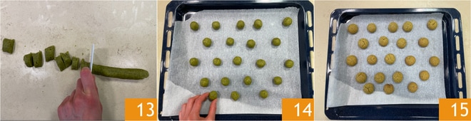 De este corta piezas de aproximadamente 2 cm 13, forma bolitas y colócalas en una bandeja forrada con papel de horno 14. Hornea en horno estático precalentado a 165º durante 20 minutos. Una vez cocidos, sácalos del horno y déjalos enfriar 15.