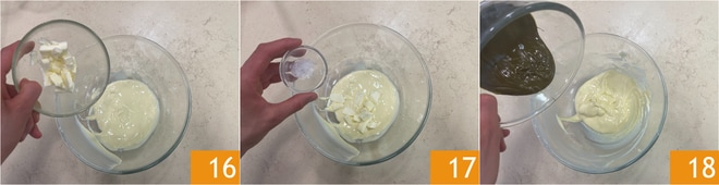 Prepara ahora la crema de pistacho: en un bol mezcla el chocolate fundido caliente, la mantequilla 16, la sal de Maldon 17, mezcla para disolver la mantequilla, luego añade la crema de pistacho 18