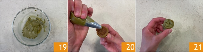 Mezcla nuevamente para obtener una crema homogénea 19 y pásala a una manga pastelera. Toma una galleta, exprime la crema encima 2021.