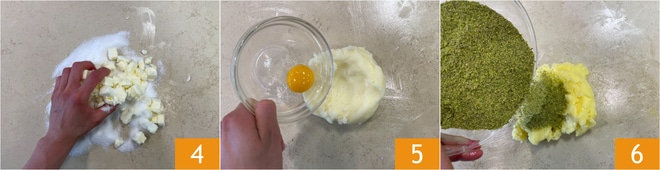 Amasa para formar un bloque 4. Incorpora la yema 5 y añade también la harina de pistacho 6.