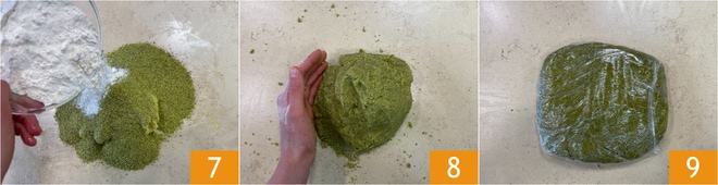 Finalmente añade la harina 00 7, amasa para formar un bloque homogéneo 8, envuélvelo en film transparente 9 y déjalo reposar en la nevera durante 2 horas.