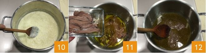 luego deja hervir a fuego muy bajo durante 15/20 minutos hasta que el ajo se ablande 10. Coloca a calentar en una cacerola medio vaso de aceite y luego añade las anchoas 11, prosigue la cocción a fuego bajo asegurándote de que el aceite no fríe, remueve con una cuchara de madera para hacer que las anchoas se disuelvan 12.