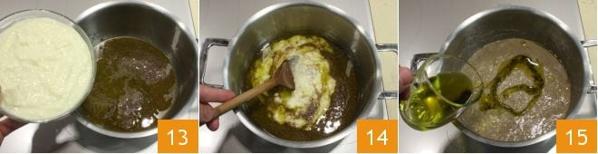 Cuando las anchoas se hayan reducido a una crema, vierte en la cacerola el ajo cocido en la leche 13. Mezcla para amalgamar los ingredientes 14 y añade el aceite restante 15, cuece a fuego bajo durante 20-30 minutos, el aceite no debe nunca freír y la salsa debe tener una consistencia cremosa. Cuando la cocción esté terminada, sirve la bagna caoda con leche en el característico "fujot" y acompáñala con las verduras como manda la tradición.