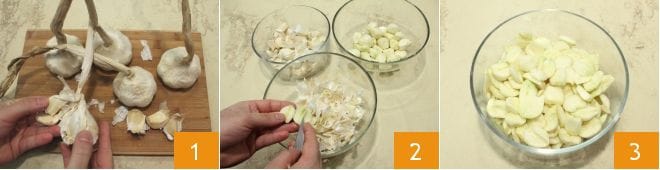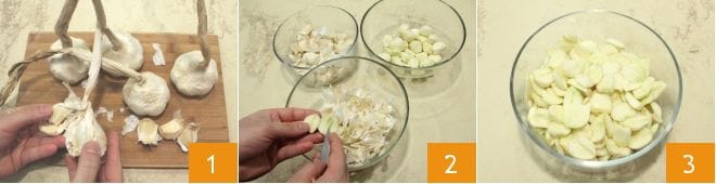 Para preparar la bagna caoda, comienza pelando las cabezas de ajo, retirando la piel de cada diente 1, luego con un cuchillo pequeño corta los dientes a la mitad y retira el brote 2 y córtalos en rodajas 3.