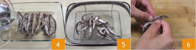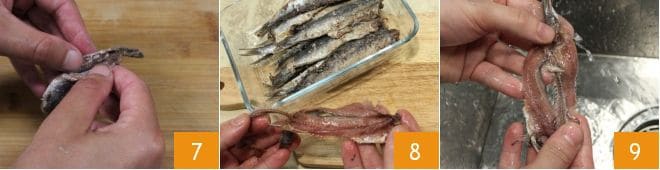 ábre las a la mitad 7 y retira las vísceras con la espina central 8 y enjuágalas bajo agua corriente 9.