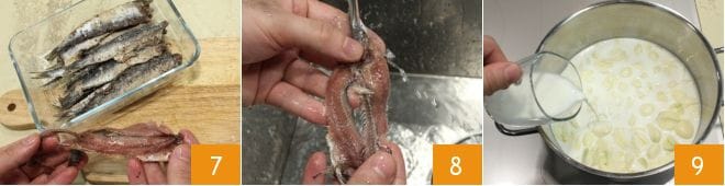 y retira las vísceras con la espina central 7 y enjuágalas bajo agua corriente 8. Luego cubre una pequeña bandeja o una bandeja para hornear con papel absorbente y coloca los filetes abiertos. Coloca los dientes de ajo en un cazo y vierte la leche fresca 9, lleva a ebullición,