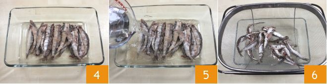 Reserva el ajo y ocúpate de desalar las anchoas en sal: coloca las anchoas en un bol 4 y cúbrelas con agua fría 5, déjalas en remojo durante 2-3 horas, cambiando el agua con frecuencia para eliminar la sal. Realiza esta operación con mucho cuidado para evitar que las anchoas se deshagan. Una vez que las anchoas estén suaves, escúrrelas 6
