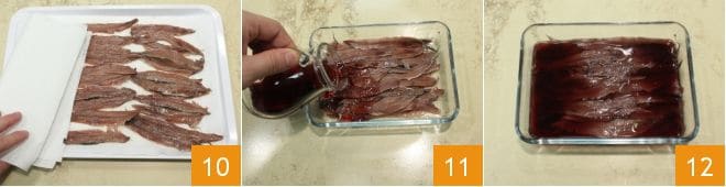 Luego cubre una pequeña bandeja o una bandeja para hornear con papel absorbente y coloca los filetes abiertos. Seca los filetes 10 y luego colócalos en una fuente y lávalas con vino tinto removiéndolas delicadamente (11-12). Transfiere nuevamente las anchoas a una bandeja