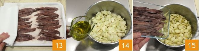 y sécalas con papel absorbente 13. Coloca el ajo en una cacerola y vierte 100 gr de aceite de oliva 14, comienza a cocinar a fuego muy bajo, removiendo con una cuchara de madera y asegurándote de que no tome color. Añade las anchoas 15 mezclando delicadamente.
