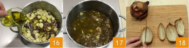 Cubre con el aceite restante 16 y lleva la salsa a cocción a fuego lento durante media hora, asegurándote de que la bagna no fríe 17. Mientras tanto, prepara las verduras para acompañar la bagna caoda, encárgate de las cocidas: asa las cebollas en el horno con la piel, luego córtalas en gajos 18,