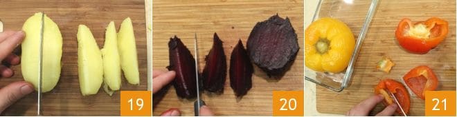 cuece las patatas en agua hirviendo, no deben estar demasiado blandas para que puedan cortarse en gajos 19 y finalmente cuece la remolacha en el horno y córtala como las otras verduras 20. Asa los pimientos en el horno y córtalos obteniendo también de estos unos gajos 21.