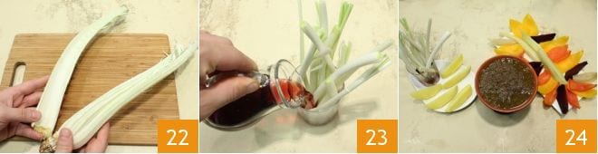 Pasa ahora a las verduras crudas: lava los cardos elimina las extremidades 22 y los filamentos externos y córtalos por la mitad en sentido longitudinal. Lava los cebolletas y sumérgelos en el vino, mejor si es barbera, como dice la tradición 23. Una vez disueltas las anchoas, tu bagna caoda estará lista para servir en la mesa, preferiblemente en el característico "fujot" 24.