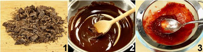 Para preparar el banana split, comienza a preparar los dos siropes: para el de chocolate pica el chocolate negro con un cuchillo 1, fúndelo al baño María y añade unos 30 ml de nata calentada en un cazo removiendo continuamente 2. Pasa por un colador 2 cucharadas de mermelada de fresas 3 para eliminar las semillas y obtener así un puré. Monta la nata fresca restante.