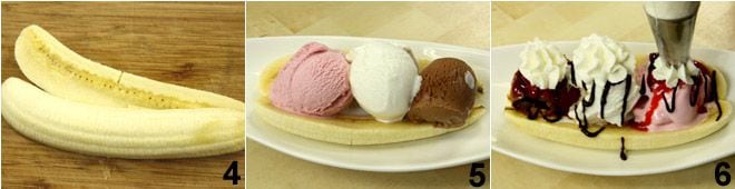 Corta a la mitad un plátano a lo largo 4 y colócalo en un plato ovalado o en una "barca", dispón luego una bola de helado de fresa, una de helado de vainilla y una de helado de chocolate 5. Luego decora con los siropes de fresa y chocolate al gusto y con la nata montada 6. Finalmente adorna el banana split con granillo de avellana, virutas de chocolate y cerezas confitadas.