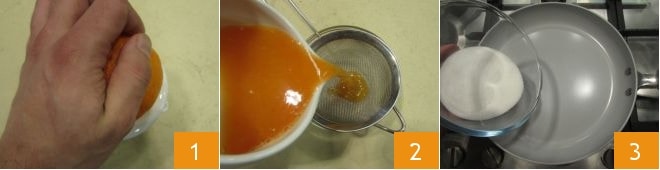 Para preparar los plátanos flameados comenzad exprimiendo la naranja 1 y filtrando su jugo 2. Luego tomad una sartén antiadherente en el fuego y haced derretir el azúcar 3.