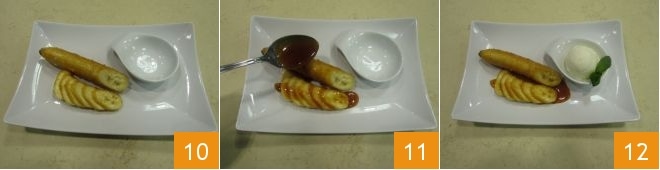Ahora que los plátanos están cocidos, cortad medio plátano en rodajas 10 y colocadlo en un plato de postre. Al lado del plátano cortado, colocad el otro plátano y verted encima de ambos la salsa de caramelo 11. Podéis servir dejando el plátano flameado entero o cortándolo, todo o en parte, en rodajas para colocarlas una junto a la otra para una elegante presentación de la fruta. También podéis servir estos exquisitos plátanos flameados con una bola de helado de vainilla o chocolate.
