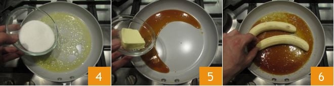 Cuando empiece a caramelizarse 4, adquiriendo una coloración rubia oscura, añadid la mantequilla 5. Tan pronto como la mantequilla se haya derretido, añadid en la sartén a fuego lento los plátanos pelados aún enteros durante 1-2 minutos 6. Giradlos delicadamente de ambos lados para no romperlos pero asegurándoos de que absorban el calor uniformemente.