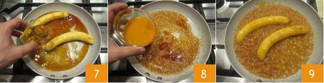 En este punto, añadid el ron 7 y dejad que prenda fuego, inclinando ligeramente la sartén hacia la llama o utilizando un soplete de repostería. Cuando las llamas se hayan reducido hasta desaparecer por completo, quitad los plátanos de la sartén y reservadlos. En el caramelo restante en la sartén, añadid el jugo de naranja 8 y emulsionad con una cuchara de madera. Luego volved a poner los plátanos en la sartén y cocinadlos otra vez dándoles la vuelta para una cocción uniforme 9.
