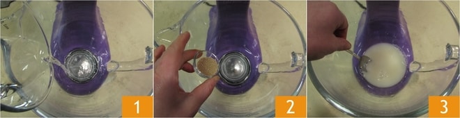 Para realizar los baozi, primero preparad la masa: verted el agua en el bol de una batidora con gancho 1, añadid la levadura seca 2 y mezclad brevemente con una cuchara para disolverla 3.
