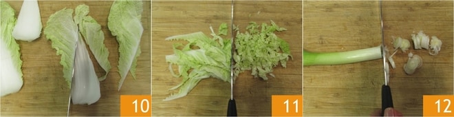 Mientras tanto preparad el relleno: eliminad la costilla central de la col china 10 y picad la hoja 11, luego picad finamente también la cebolleta 12.