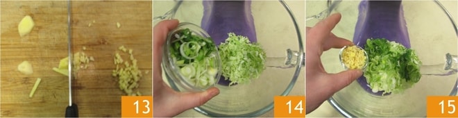 Pelead y picad el jengibre, o alternativamente podéis rallarlo 13. En el bol de la batidora con una pala, verted la col china, la cebolleta 14 y el jengibre 15.