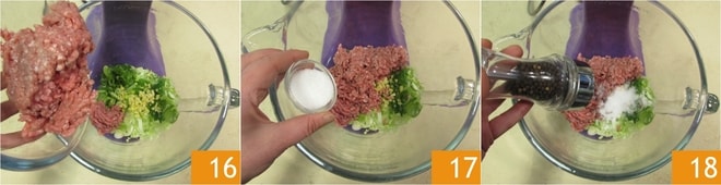 Añadid la carne picada de cerdo 16, el azúcar 17, la sal y la pimienta 18.