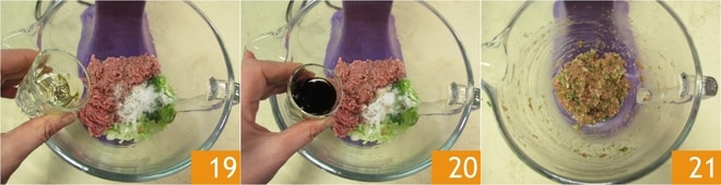 Por último, condimentad con el aceite de sésamo 19 y la salsa de soja 20 y encended la batidora a velocidad mínima durante 5 minutos, hasta que los ingredientes estén bien mezclados 21.