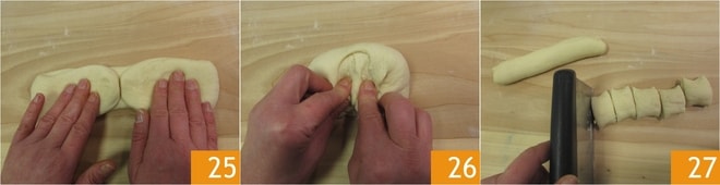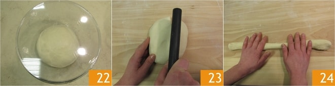 Transcurrido el tiempo de levadura 22, trasladad la masa a una superficie de trabajo ligeramente enharinada y, después de trabajarla brevemente, divididla en 3 porciones con la ayuda de una rasqueta 3. Estirad cada porción con la punta de los dedos para formar cilindros 24.