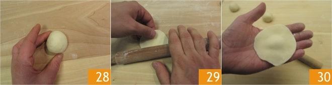 Redondead cada trozo de masa sobre la superficie de trabajo para formar una bolita 28, luego aplastadla con la palma de la mano. En este punto, tomad un pequeño rodillo y presionadlo en los bordes del disco con la mano derecha, mientras con la mano izquierda giráis la masa en sentido antihorario 29; de esta manera los bordes serán más delgados mientras el centro quedará más grueso para retener mejor los jugos del relleno 30.