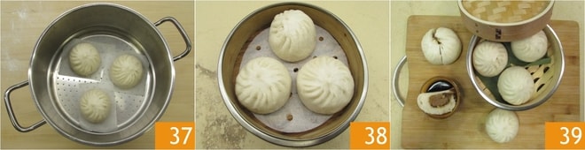 Pasado este tiempo, estáis listos para la cocción: llevad a ebullición el agua en una vaporera y colocad los baozi junto con su cuadrado de papel de horno 37. Cubrid con la tapa y coced durante unos 12-13 minutos. Una vez cocidos, apagad el fuego y dejadlos reposar en la olla durante otros 2 minutos, luego trasladadlos a la tradicional cesta de bambú 38. ¡Vuestros baozi están listos para ser servidos 39!