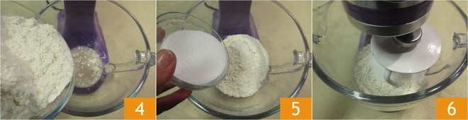 Añadid la harina de trigo 4 y el azúcar 5 y encended la batidora a velocidad mínima durante 5-6 minutos 6.