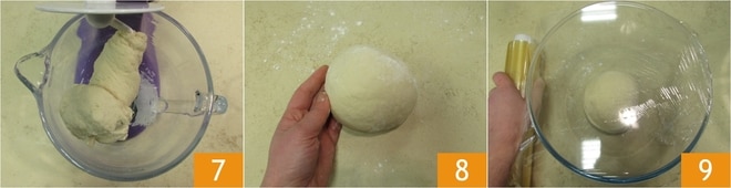 Cuando la mezcla esté compacta 7, trasladadla a una superficie de trabajo ligeramente enharinada y trabajadla brevemente para darle una forma redonda y lisa 8. Colocad la masa en un bol, cubrid con film 9 y dejad reposar a temperatura ambiente durante unos 40 minutos.