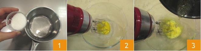 Para realizar el barquillo de pandoro con mousse de ricotta y Nutella®, primero pon a remojar la gelatina en agua fría, luego prepara el jarabe: vierte 15 g de agua en un cazo, añade 40 g de azúcar 1 y lleva la mezcla a la temperatura de 121°. Pon las yemas en un bol y bátelas con las varillas eléctricas 2, luego vierte el jarabe de azúcar en forma de hilo 3