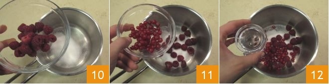 Mientras tanto, puedes preparar la salsa de frutos rojos: en un cazo vierte el azúcar, las frambuesas 10, las grosellas 11 y 5 g de agua 12