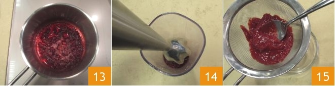 y cocina brevemente, justo el tiempo de hacer disolver el azúcar 13. Transfiere la salsa a un recipiente alto y estrecho y bate con una batidora de inmersión 14, luego tamízala a través de un colador de malla fina 15 y reserva.