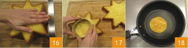 Transcurrido el tiempo de enfriamiento de la mousse, puedes encargarte de la composición del postre: corta el pandoro en rebanadas horizontales de aproximadamente 1 cm de grosor 16 y saca discos utilizando un cortapastas de 9 cm de diámetro 17. Coloca los discos de pandoro en una sartén caliente y tuéstalos ligeramente por ambos lados 18.