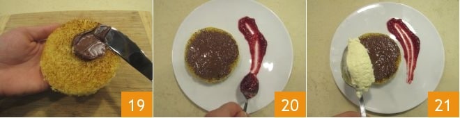 Una vez enfriados, unta los discos de pandoro con 15 g de Nutella® cada uno 19, colócalos en un plato y pinta el plato con la salsa de frutos rojos 20. Añade una quenelle de mousse de ricotta sobre el barquillo de pandoro 21