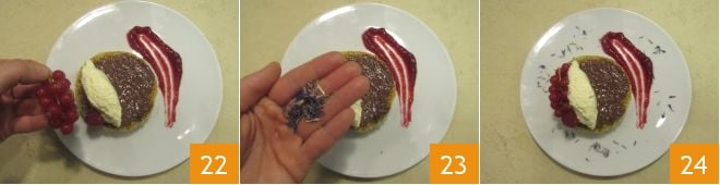 y decora con una frambuesa y un ramito de grosellas 22. Finalmente decora el plato con flores comestibles 23: ¡tu barquillo de pandoro con mousse de ricotta y Nutella® está listo para ser servido 24!