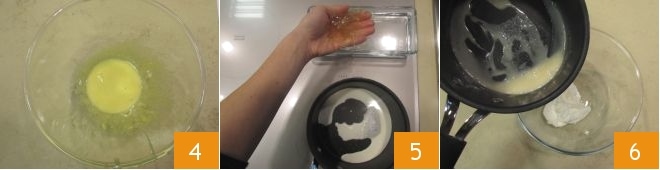 y sigue trabajando la mezcla hasta que esté fría 4: de esta manera habrás obtenido una pâte à bombe. Ahora calienta unos 20 g de nata, exprime las hojas de gelatina y disuélvelas en la nata caliente 5, mezclando cuidadosamente. Tamiza la ricotta en un bol, vierte la mezcla de nata y gelatina dentro del bol 6 y trabaja todo con la batidora o con una espátula.