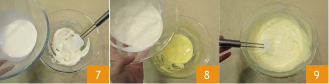 Incorpora la nata restante (unos 80 g) 7 y mezcla de nuevo para integrarlo todo. Ahora añade la mezcla obtenida a la pâte à bombe 8, mezclando suavemente con una espátula de abajo hacia arriba para incorporarla 9. Cubre el bol con papel film y deja enfriar la mousse de ricotta en la nevera durante al menos 2 horas.