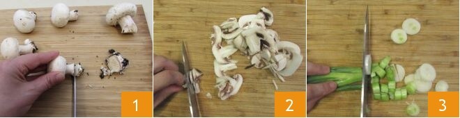 Para preparar los palitos de salmón con crema de setas a las hierbas, primero limpia los champiñones, corta la base 1 y elimina los restos de tierra con un paño; luego córtalos en rodajas finas 2. Despunta el cebollino y córtalo en rodajas 3.