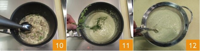 Apaga el fuego y tritura la mezcla con una batidora de inmersión 10 hasta obtener una crema homogénea, añade el hinojo y la mejorana 11 y deja en infusión. Una vez que la salsa se haya enfriado, pásala por un colador 12 para hacerla más suave.