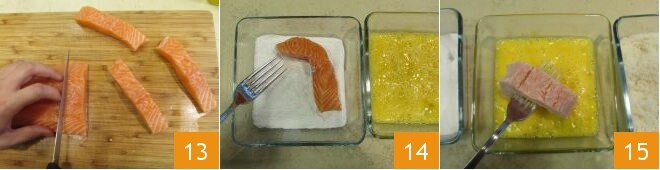 Divide el salmón en 8 rectángulos iguales de aproximadamente 2,5 x 11 cm 13. Pasa cada palito primero por la harina de arroz 14, luego por los huevos batidos 15