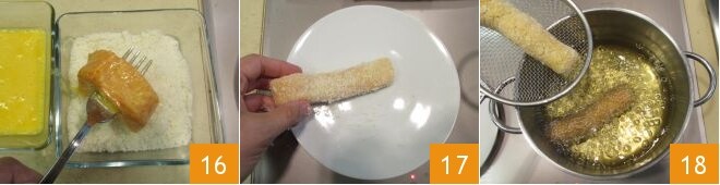 y finalmente por el panko 16. Una vez que hayas empanado todos los palitos 17, podrás pasar a la fritura: pon en una cazuela el aceite de semillas y caliéntalo, cuando haya alcanzado los 170°, podrás sumergir los palitos 18, pocos a la vez, durante unos 2 minutos o hasta que estén dorados.