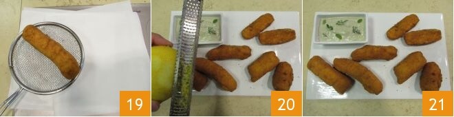Una vez cocidos, escurre los palitos sobre papel absorbente 19. Sazona los palitos de salmón con la ralladura de limón 20 y sírvelos bien calientes con la crema de champiñones 21.