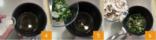 En una cazuela, vierte el aceite y añade el ajo 4, sofríe durante 3 minutos a fuego moderado y luego añade los cebollinos 5 y los champiñones 6
